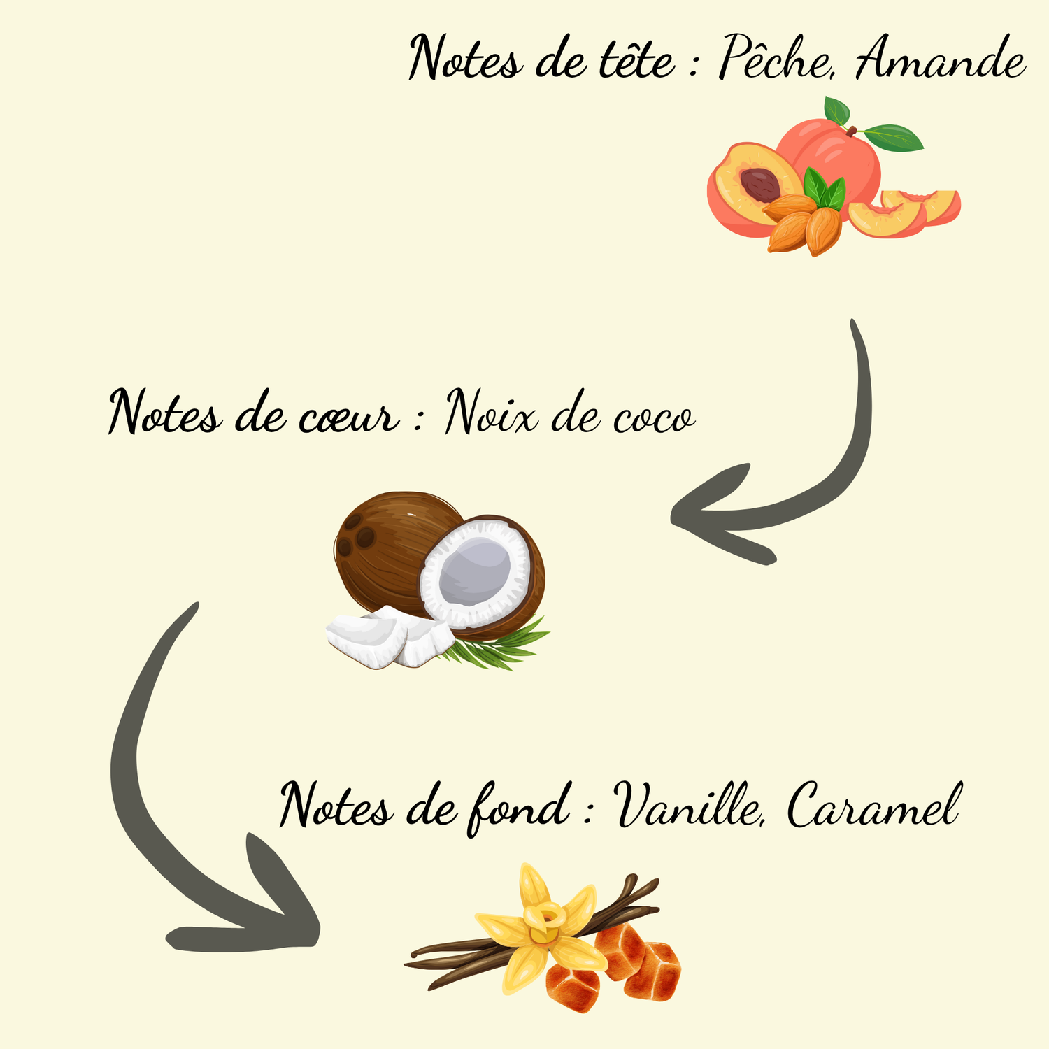 Cette fragrance s'ouvre sur un duo gourmand de Pêche et d'Amande. Elle évolue rapidement vers un cœur enveloppant de Coconut. Le fond se révèle ensuite avec la douceur réconfortante de la Vanille et du Caramel.